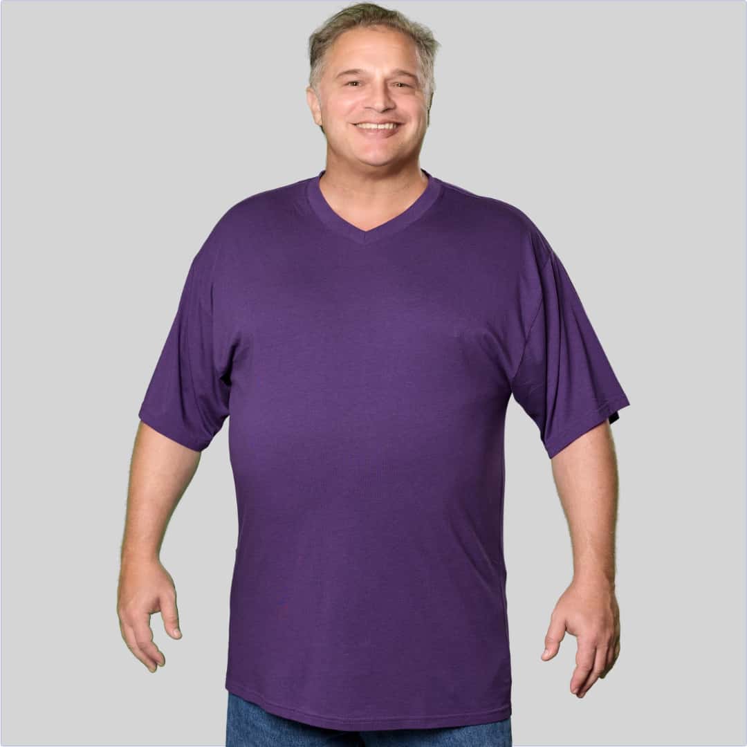 We believe Big men deserve style, too. That’s why our V-Neck Bamboo T-Shirts are available in seven versatile colors: Licorice (Black), Blueberry (Dark Blue), Oyster (Dark Gray), Wine (Red), Chocolate (Brown), Pesto (Dark Green), and Eggplant (Purple). Whether you’re dressing it up or keeping it casual, this v-neck works for every occasion.